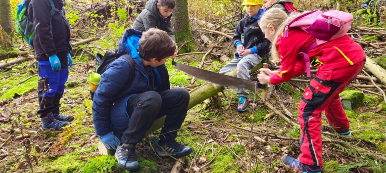 Der letzte Tag der Ferienbetreuung stand ganz im Zeichen des Feuermachens. Gemeinsam wurden Birkenhäutchen als erstes Brennmaterial und trockene Fichtenzweige zum Vergrößern des Feuers gesammelt. Für das große Feuer wurden mit großer Begeisterung drei kleine trockene Fichten gefällt, welche die Kinder im Anschluss unter Anleitung mit Sägen in kleinere Holzstücke schnitten und mit Bollerwagen zur Hütte schafften. Mit Hilfe eines Feuerstahls gelang es schließlich, den ersten Funken zu schlagen und kurze Zeit später loderte ein kräftiges Feuer.