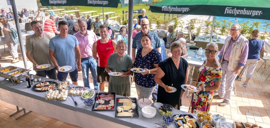 Rund 100 Unnauer Mitbürgerinnen und Mitbürger der Generation 65plus hatten sich auf Einladung der Ortsgemeinde zum Frühstück im Freibad eingefunden und verlebten gemeinsam ein paar schöne Stunden. Ortsbürgermeisterin Iris Wagner (vorne 2. v.r.) und Bürgermeister Andreas Heidrich standen gerne für einen Austausch beim Frühstück zur Verfügung.