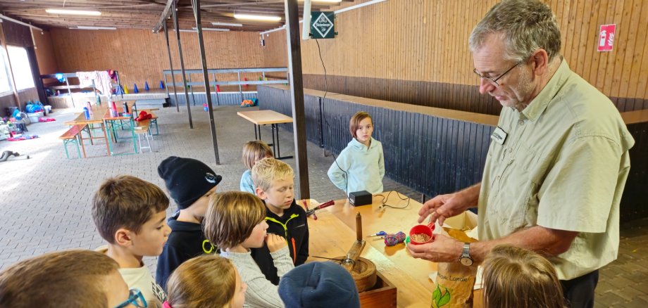Beim Waldspaziergang auf Spurensuche lernten die Kinder, Tierspuren zu erkennen, gefundene Pilze zu bestimmen und entdeckten sogar Hinweise auf Wildschweine, die sich – wie der Waldpädagoge erklärte – im Herbst mit Eicheln ihren Winterspeck anfressen.