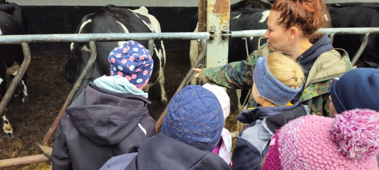 Ein besonderes Erlebnis war der Ausflug zum Bio-Bauernhof Albertshof in Rennerod, einem Milchviehbetrieb durch den Sarah Schell-Hahn führte. Dort halfen die Kinder beim Ausmisten des Kuhstalls, erfuhren Wissenswertes über Kühe, Kälber und Hühner, schauten beim Melken mit einer Melkmaschine zu und durften die Tiere füttern. Besonders beeindruckend war das Eiersammeln bei den Hühnern. Zum Mittagessen gab es von Herrn Frenzel zubereiteten Milchreis mit frischer Milch vom Hof, dazu von den Kindern am Vortag selbstgemachtes Apfelmus – ein Genuss, der allen schmeckte.